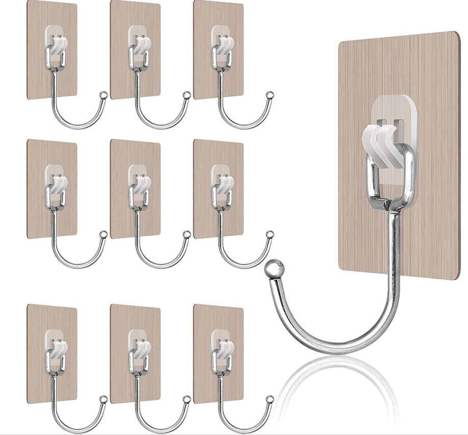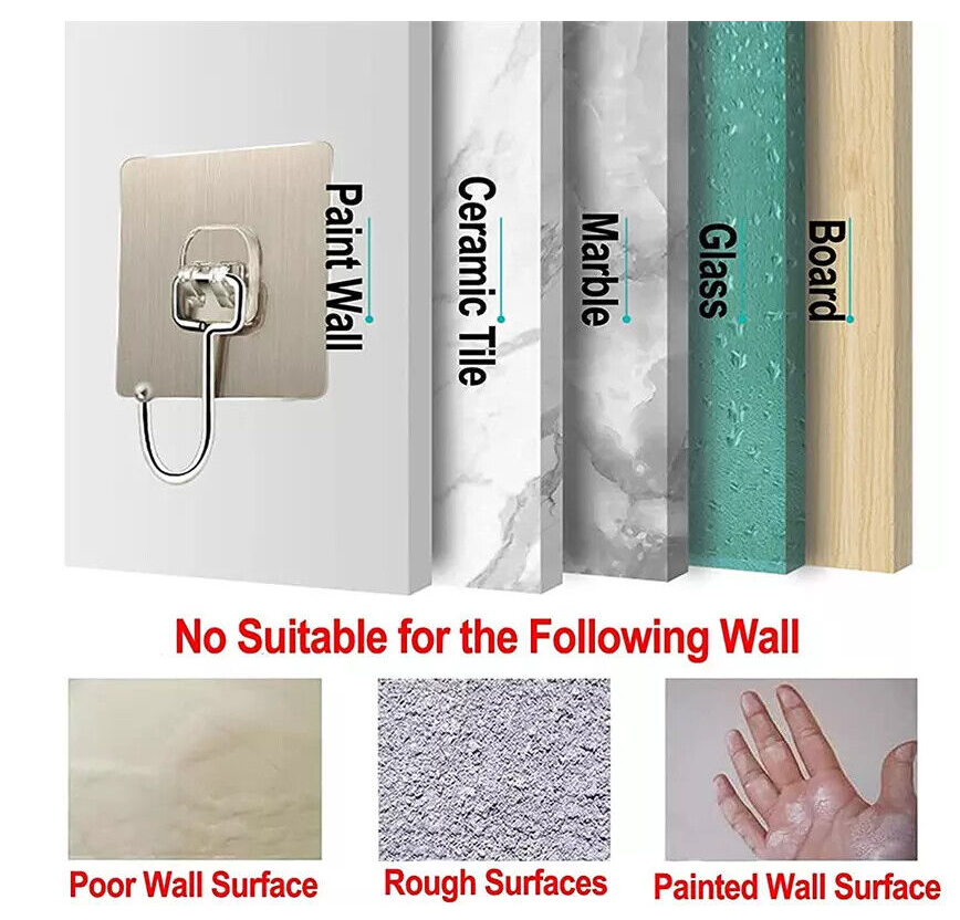 ?Widely Application?: Large adhesive hooks can be widely used on a variety of surfaces, like smooth tile, glass, mirror, wood, metal surface and so on((Painted walls, wallpaper surfaces and rough surfaces not advised).