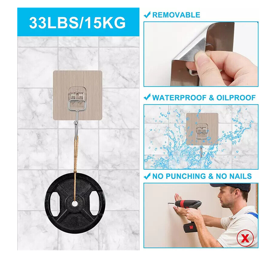 ?Easy to Use?: There is no need for messy or complicated installation as the hooks are self-adhesive. Just peel off the adhesive strip and stick the hook on a smooth surface. Maximum portability:33LB