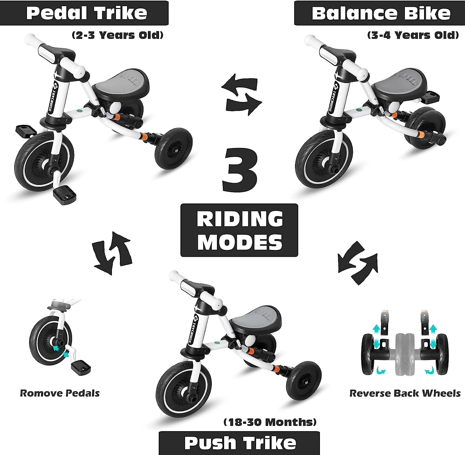 LOL-FUN 4 in 1 Toddler Balance Bike for 1-4 Years Old Boys Girls Gift, 3 Wheel Baby Bicycle for 1 Year Old Kids Tricycle with Easy Assembly Removable Pedal