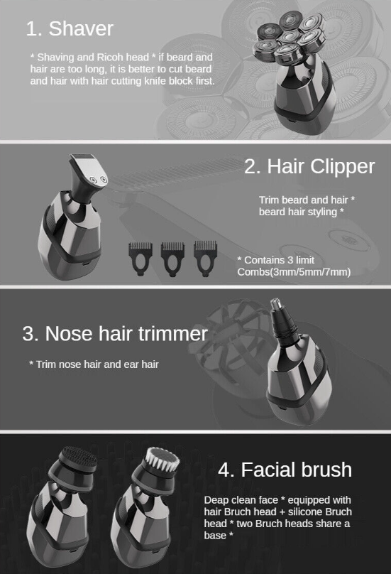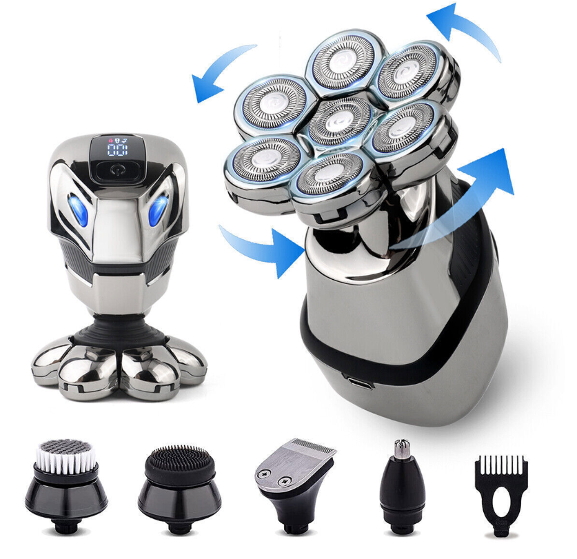 Men's Multifunctional Electric Shaver includes six detachable accessories, including 7-head razor, hair clipper, nose trimmer, facial cleansing brush, body trimmer and hairbrush for different hair and beard styles. Meets all your shaving and facials needs.