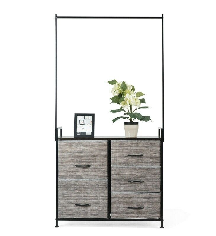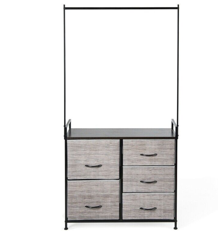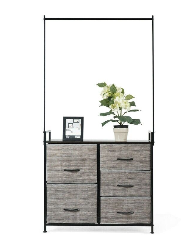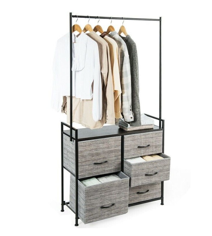 This organizer has five drawers of different sizes to help you store clothes, toys, towels, etc. The hanging rod is wide enough to hang clothes and other accessories. Made of a sturdy steel tube and high-density materials, the entire organizer is stable and features a high weight-bearing capacity.