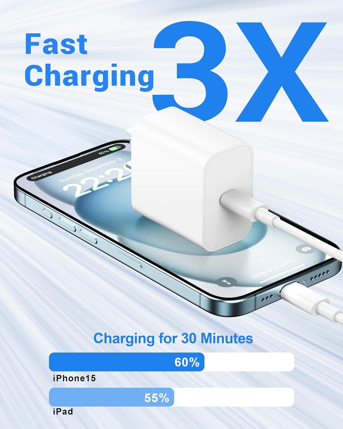 • 【for iPhone 15 / iPad Fast Charger USB C】 With the 20W PD USB C Charger Block and 10FT long USB C to C cable, which can reach up to 3X faster than the standard 5W charger. You can full charge the iPad Pro 12.9 in about 2.5 hours.