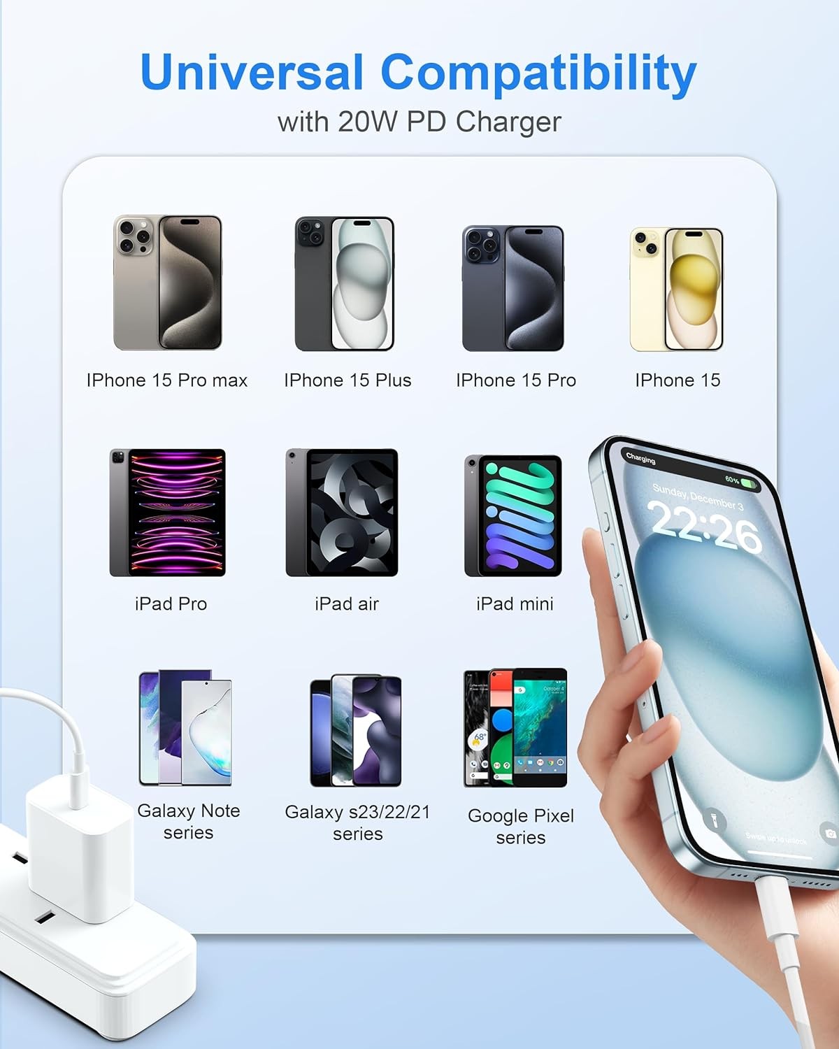 • 【Universal Compatibility】 20W USB C Fast Charger Compatible with most USB-C devices, including for iPhone 15/15 Plus/Pro Max, iPad Pro 12.9 inch 6th/5th/4th/3th (2022/2021/2020/2018), iPad Pro 11 inch 4th/3th/2th/1th (2022/2021/2020/2018), iPad Air 5th (2022), iPad Air 4th (2020), iPad Mini 6th Gen (2021), iPad 10th Generation 10.9 inch (2022); Also compatible with Google Pixel 7/6/5/4/3/2/XL, and more USB C android phones.