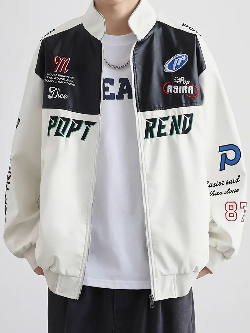 Men's Stylish PU Leather Letters Pattern Jacket With Pockets, Casual Breathable Stand Collar Zip Up Long Sleeve Jacket For Outdoor Activities