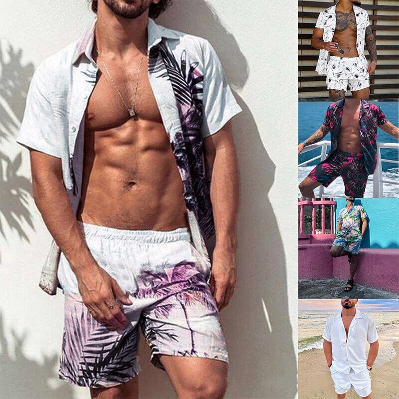 Men's Summer Hawaii Outfits Short Sleeve Shirts +Shorts Casual Beach 2Pcs Sets