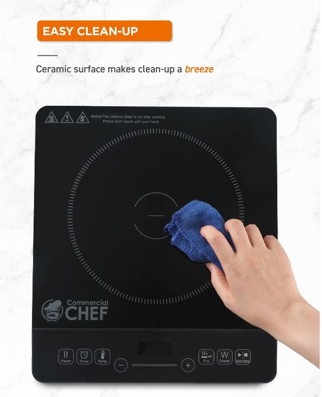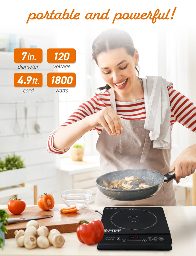 Product details This incredible small induction cooktop (12.99” x 11.42” x 2.56”) helps facilitate amazing meals whether you’re in a small kitchen, apartment, RV or dorm. This compact induction stove (6 lbs.) boasts 8 temperature settings ranging between 160° to 440° F with a 7” diameter cooking surface. Button control panel included as well as LED display and a ceramic surface for streamlined cleaning. Induction cooktop portable comes with overheat protection, 3-hour timer and anti-slip feet to ensure total safety. Our induction burner has a power cord length of 4.9 ft., 120V/1800W in addition to a voltage warning system. UL certified. This versatile cooktop burner comes with ISTA 6A packaging to guarantee total customer satisfaction. PORTABLE & POWERFUL: While our small induction cooktop (12.99” x 11.42” x 2.56”) is lightweight (6 lbs.) it packs a punch with up to 1800 Watts. Cook your favorite meals wherever you go—whether on vacation or in a small apartment, RV or dorm. This induction burner has a 7” diameter cooking ceramic surface that’s easy to clean and can accommodate some of your preferred pots and pans. Boil water, simmer tomato sauce or fry up your favorite protein with this portable single induction cooktop. 8 TEMPERATURE SETTINGS: Our best portable induction cooktop offers a variety of temperature settings so you can find the perfect heat. Temperature options impressively range between 160° to 440° Fahrenheit, guaranteeing the right level of warmth required for your favorite recipes. With this exciting induction cooker, you can control your cooking temperature more precisely than gas and electric. LED DISPLAY: Button control panel and LED display make for easy navigation with this fantastic induction stove. Determine cooktop burner temperature settings at the simple push of a button! SAFETY FEATURES: This portable induction stovetop comes with a convenient 3-hour timer and automatic shut-off for ease of use and peace of mind. Overheat and container protection with voltage warning system included. Induction cook top is UL certified with ceramic surface for easy cleaning. MAKE DELICIOUS MEALS: Whether it’s delicious pasta with homemade marinara sauce or decadent stovetop desserts, this induction burner gives you the option of making amazing meals wherever you are. Our fantastic induction cooktop 1800W requires Induction-compatible cookware for use. Concoct delectable meals with the ease and convenience of our induction countertop burner. |
