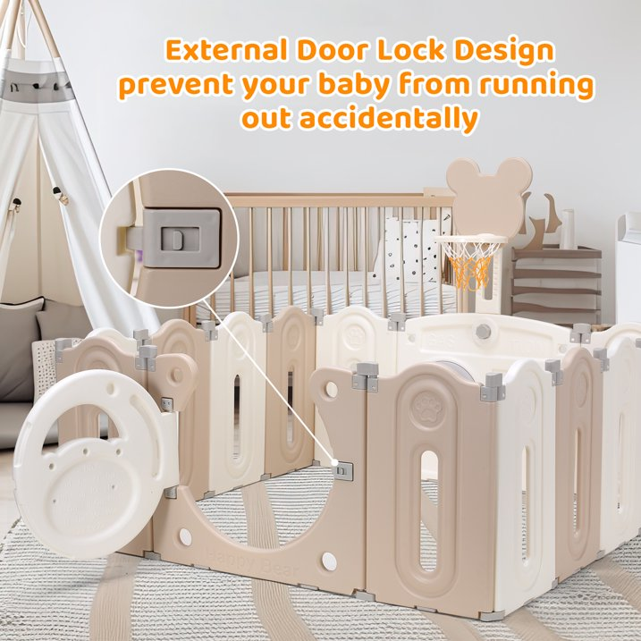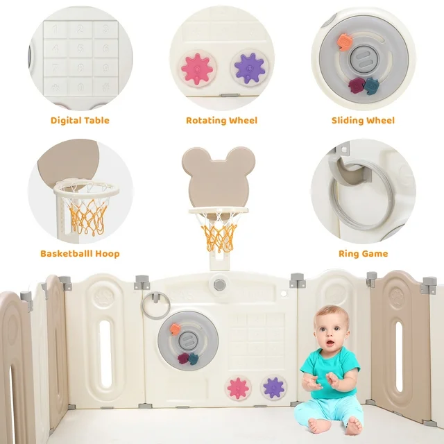 【Educational Toys Panel】The gate panel of playpen is designed to stimulate your child's development and creativity. With rotating wheels, a ball hoop, 3 rings and a digital table, it offers a range of activities that enhance hand-eye coordination, promote bone development, and cognitive skills.