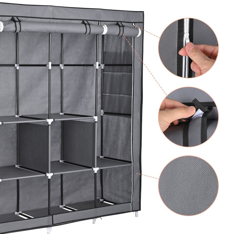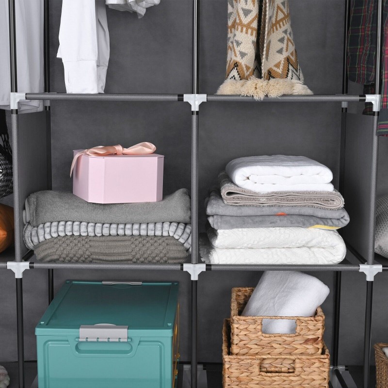 LOEFME Portable Closet Wardrobes for Hanging Clothes with 4 Hanging Rods and 6 Storage Organizer Shelves,Sturdy Storage Wardrobe for Bedroom Free Standing Cloth Rack with Cover, Gray