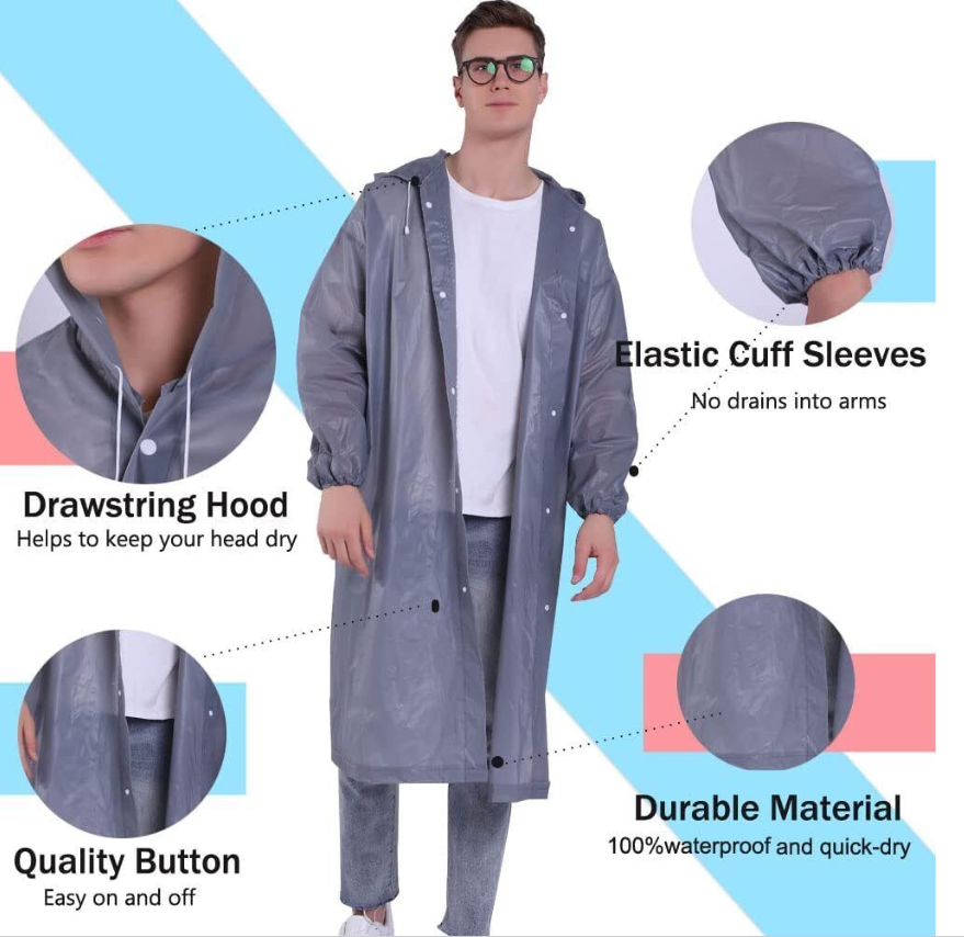 Features: This raincoat is suitable for adults,the one size design makes it great for both men and women. The rainwear is made of EVA,which is safe and durable to use,comfortable to wear.