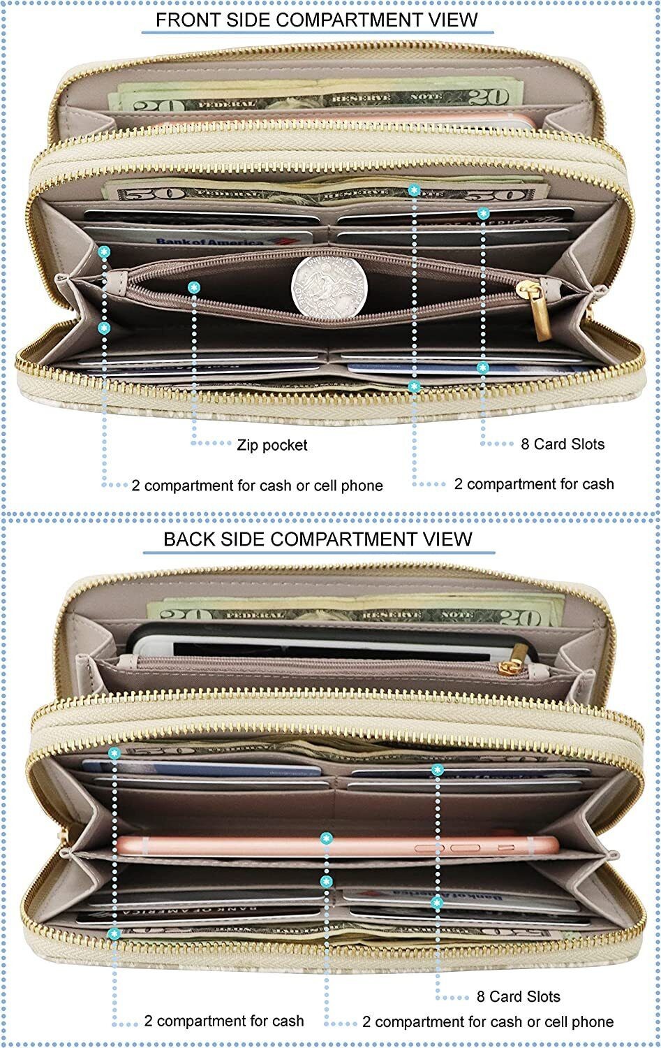 Vegan Leather Double Zipper Pocket Wallet with Grip Hand Strap (Chevron Embroide