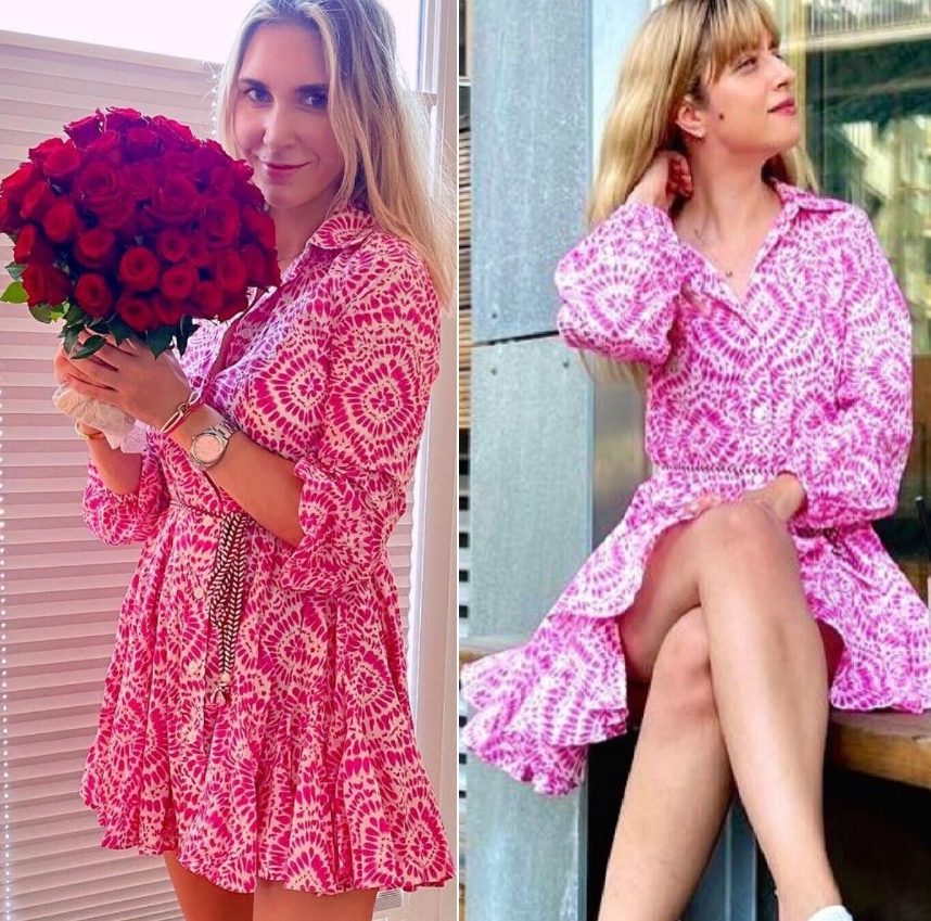 ZARA PINK TIE DYE FLORAL PRINTED MINI SHIRT DRESS VOLUMINOUS FULL SKATER SKIRT WITH BELT